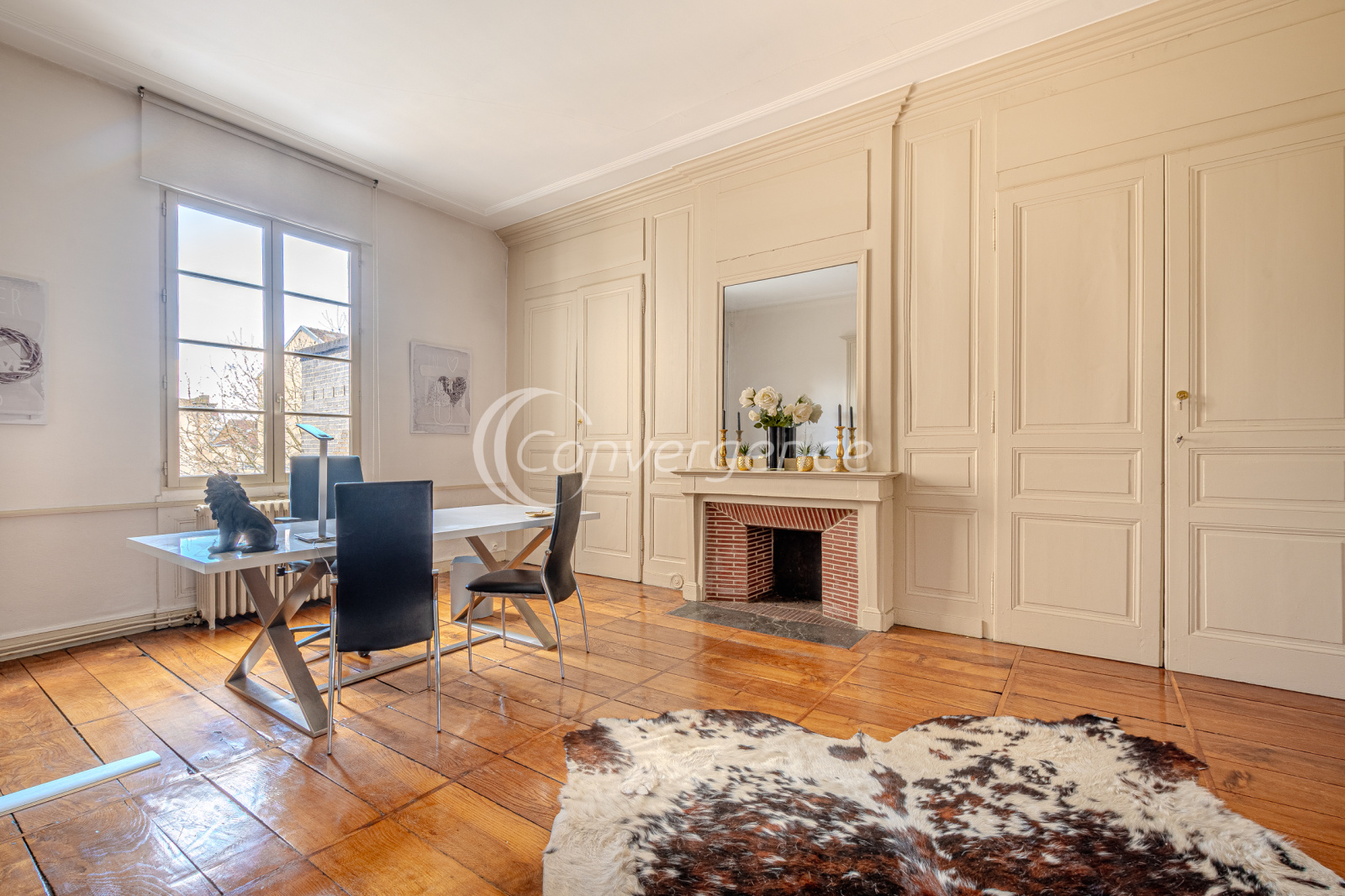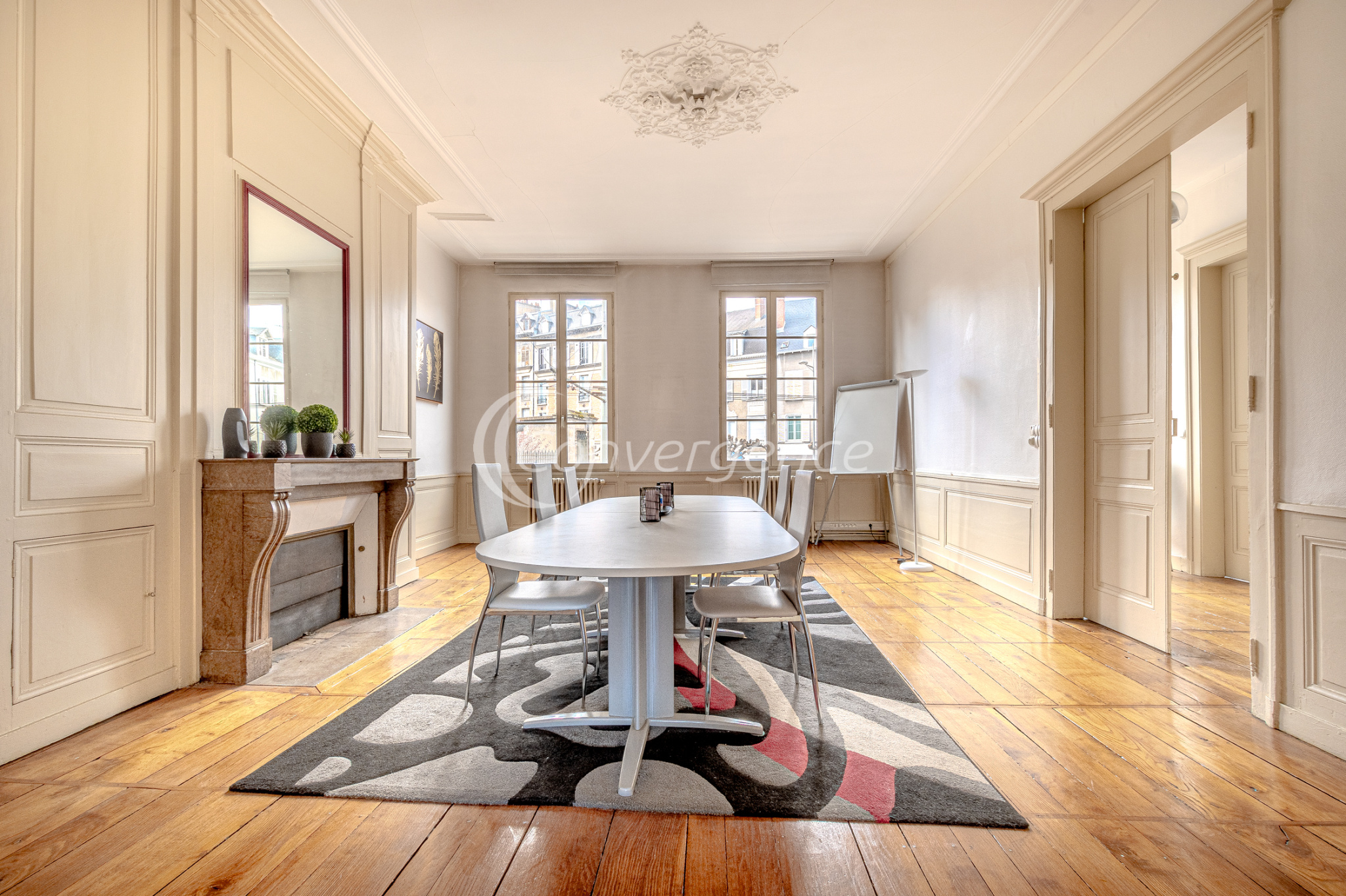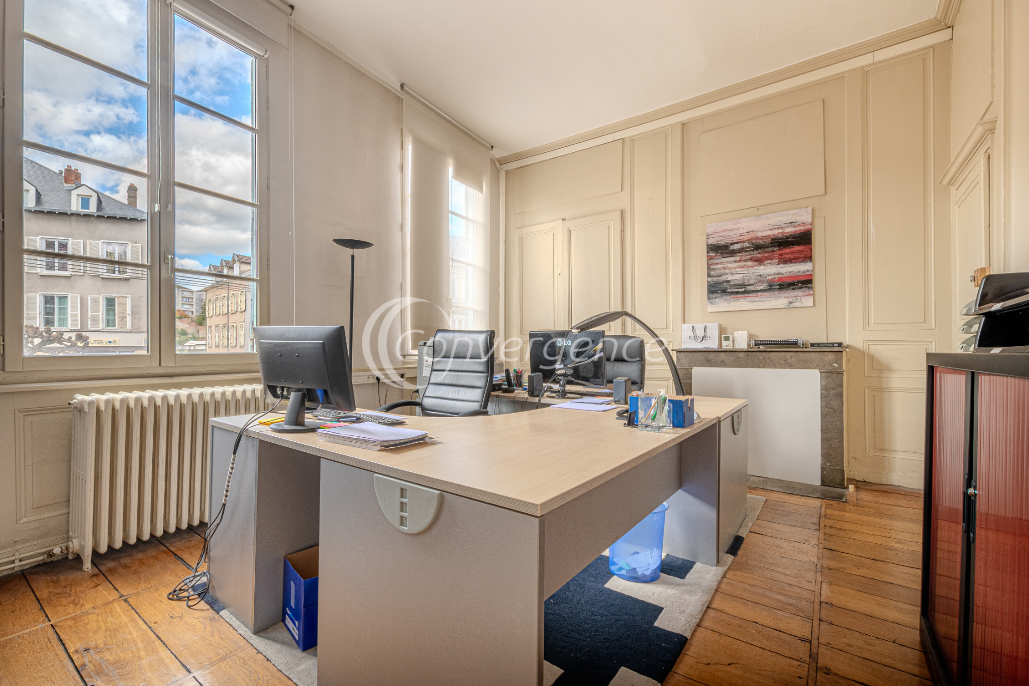 Bureaux avec charme de l'ancien de 102 m², au premier étage d'une petite copropriété au coeur du centre ville de Limoges, situé à deux pas de la place de la République. Destination mixte : bureaux et appartement, ainsi vous pouvez transformer ce bureau en charmant appartement de trois pièces. Actuellement, ce bureau professionnel propose une entrée, une salle de réunion de 32 m², deux bureaux de 21,6 m² et 29.5 m², une cuisine séparée de 7.8 m² et un wc. Chauffage individuel gaz, faibles charges de copropriété 95€ mensuel. L’emplacement, la luminosité, le parquet, la hauteur sous plafond, les moulures font le charme incontestable de cet appartement.