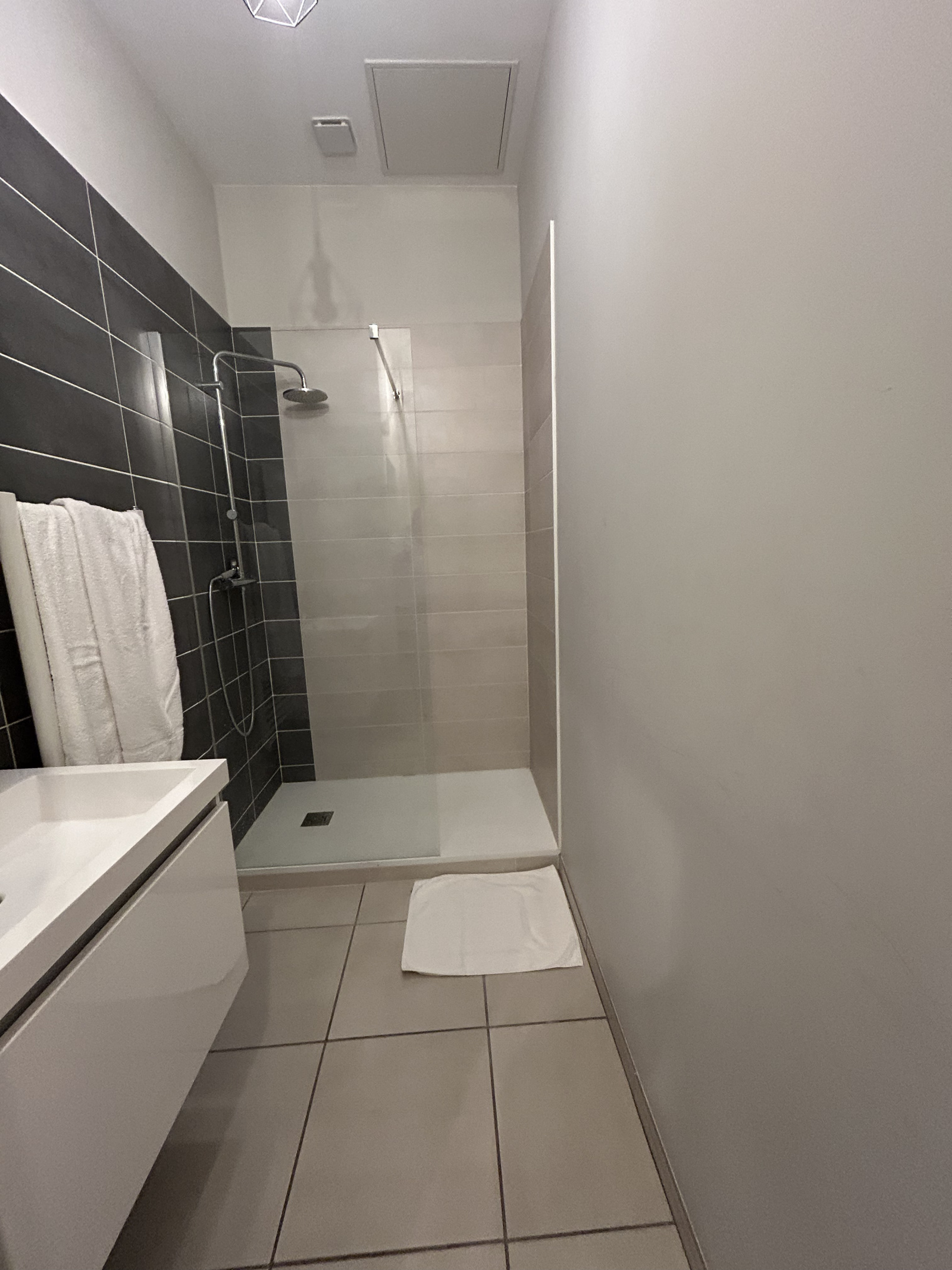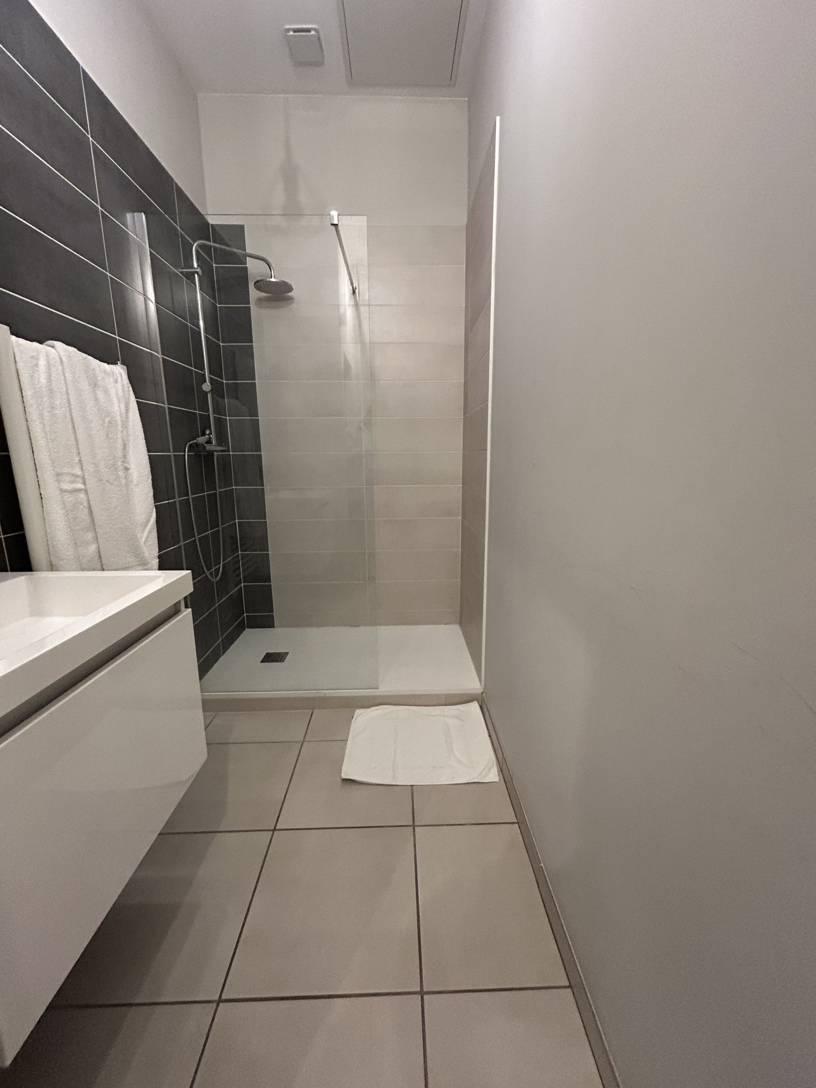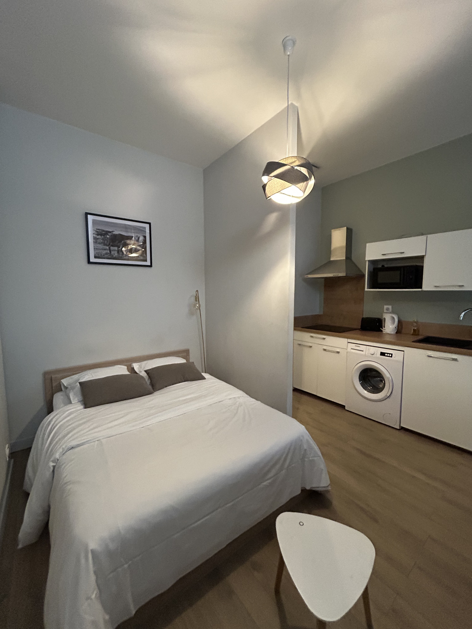 Il se compose d'une entrée, un espace à vivre avec cuisine meublée et équipée (four micro ondes, lave linge, réfrigérateur), un coin nuit, une salle de douche avec WC.