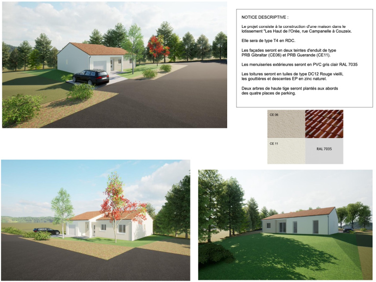 Maison de plain pied de 93.5 m² livrée en juin 2023, construction en cours dans un agréable lotissement de Couzeix sur une parcelle de 710 m². Vous profitez de la proximité des commerces dans un cadre verdoyant. La maison vous sera livrée clées en mains, finitions faites avec les peintures, les sols, les placards. Vous profitez d'une cuisine aménagée et équipée (hors frigo et lave vaisselle). Le terrain sera cloturé. La maison répond aux normes d'accessibilité PMR (Personnes à Mobilité Réduite). Entrée de 5,47 m², un wc avec fenêtre, une buanderie, un grand espace à vivre de près de 40 m², trois chambres dont deux avec placards et une salle de bains commune, une suite parentale de 17 m² avec dressing et salle d'eau privée. Garage accessible depuis le coin buanderie, porte de garage motorisée. Volets roulants électriques. Chauffage par PAC air /air dans la pièce de vie et convecteurs performants dans les chambres. Belles prestations et un agencement bien optimisé. Le lotissement se situe rue de Campanelle à Couzeix. Installez vous sans finitions ni travaux au printemps 2023. Frais de notaires réduits. Exonération de taxe foncière pendant 2 ans.