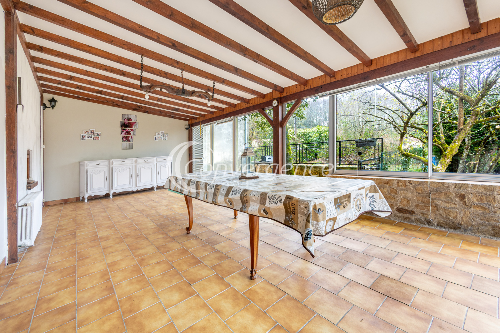 La maison principale est composée d'une entrée desservant un salon, une cuisine meublée et équipée, un espace buanderie, une véranda de 35 m², une grande pièce à vivre de 64m² avec pierres apparentes et une grande mezzanine au dessus. Une chambre parentale avec salle de douche complètent ce niveau.