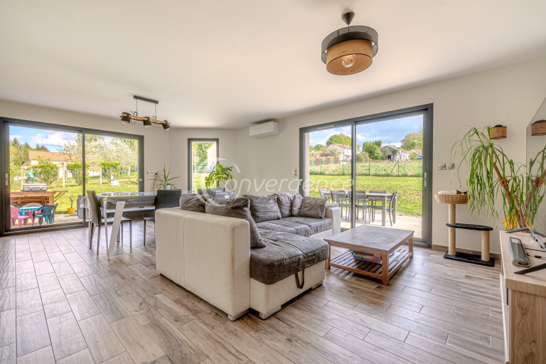 L'entrée dessert une très belle pièce à vivre comprenant un espace salon et une cuisine dinatoire aménagée et équipée très fonctionnelle. L'espace nuit se compose de 4 chambres de 11.40 m², 11.85 m², 9.9 m² et une suite parentale comprenant un dressing et une salle d'eau. Vous profitez également d'une grande salle d'eau commune, un wc séparé avec lave mains. Chauffage par pompe à chaleur air/air, climatisation dans le séjour. Chauffage électrique dans les chambres.