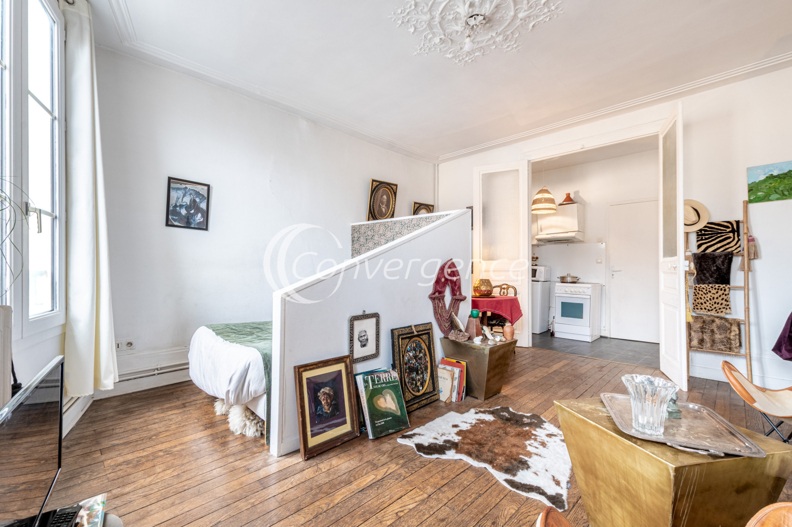 Ce studio d'environ 34m² dispose d'une pièce principale d'environ 23m² avec un coin nuit, d'une cuisine séparée, d'une salle d'eau et d'un WC séparé.