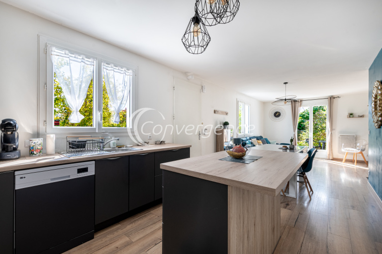 Le coint nuit comprend 3 chambres avec rangements, une salle de bains, un wc séparé. Garage de 17 m². Jardin plat, clos et arboré, portail coulissant.