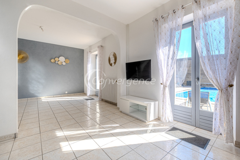 Elle est élevée sur une cave totale comprenant le local piscine, un atelier et divers espaces de stockage.