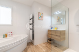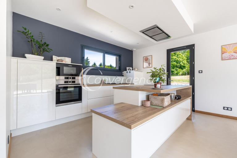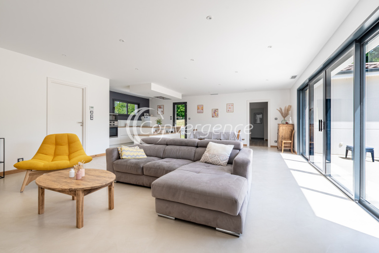 Un soin tout particulier a été apporté à l’architecture et à la disposition des pièces. Maison de haute performance énergétique (DPE en A), comprenant une entrée avec rangements, une belle pièce de vie de 54m² avec béton ciré au sol, ouverture par baie à galandage de 4,80m donnant sur une grande terrasse exposée sud. Cuisine intégralement équipée et ouverte avec îlot central. Deux espaces nuit distincts, d'un côté, deux chambres de 12m² chacune avec dressing, et une troisième de 10,55 m², une salle de bains avec douche et baignoire, un wc séparé. De l'autre coté de la maison, une suite parentale de 13m² avec dressing de 11m² et une salle d'eau avec WC. Un cellier avec espace buanderie vient compléter le bien. Double garage avec portes motorisées et hauteur sous plafond de 3m.