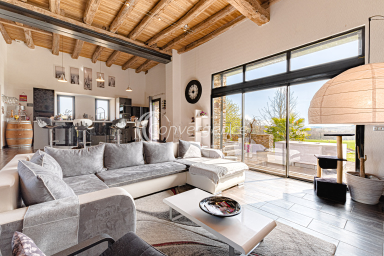 A Magnac Bourg, dans un hameau situé à 3 minutes de l'A20 au calme avec une magnifique vue dégagée depuis la terrasse de 30 m² exposée sud. La maison a été judicieusement aménagée avec goût et modernité. Vaste espace à vivre de 65 m² très lumineux avec ses grandes baies vitrées, une cuisine Schmidt élégante et fonctionnelle, un cellier et un wc.Une première chambre ou bureau communique avec le salon, le coin nuit se compose d'une salle d'eau, un wc, trois chambres dont une suite parentale avec dressing et salle de bains privée. Chauffage au sol par géothermie, volet roulant électrique dans le salon, volets bois sur le reste des ouvertures. Huissieries en aluminium. Le plancher du grenier a été refait, cet espace au dessus du salon pourrait être aménagé. Grange indépendante de 100 m² parfaite pour stationner les véhicules. Belle parcelle de terrain plat de 3500 m². Magnac Bourg dispose de tous les services et commerces de proximité et d'une école.