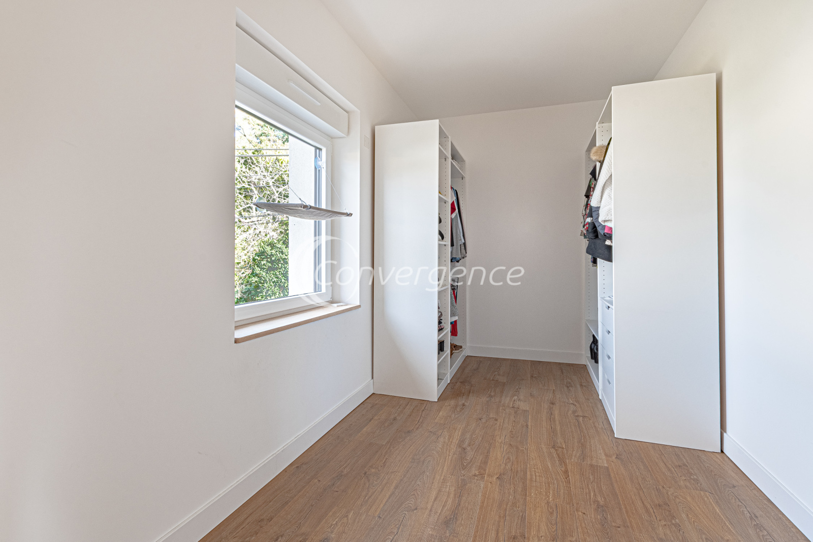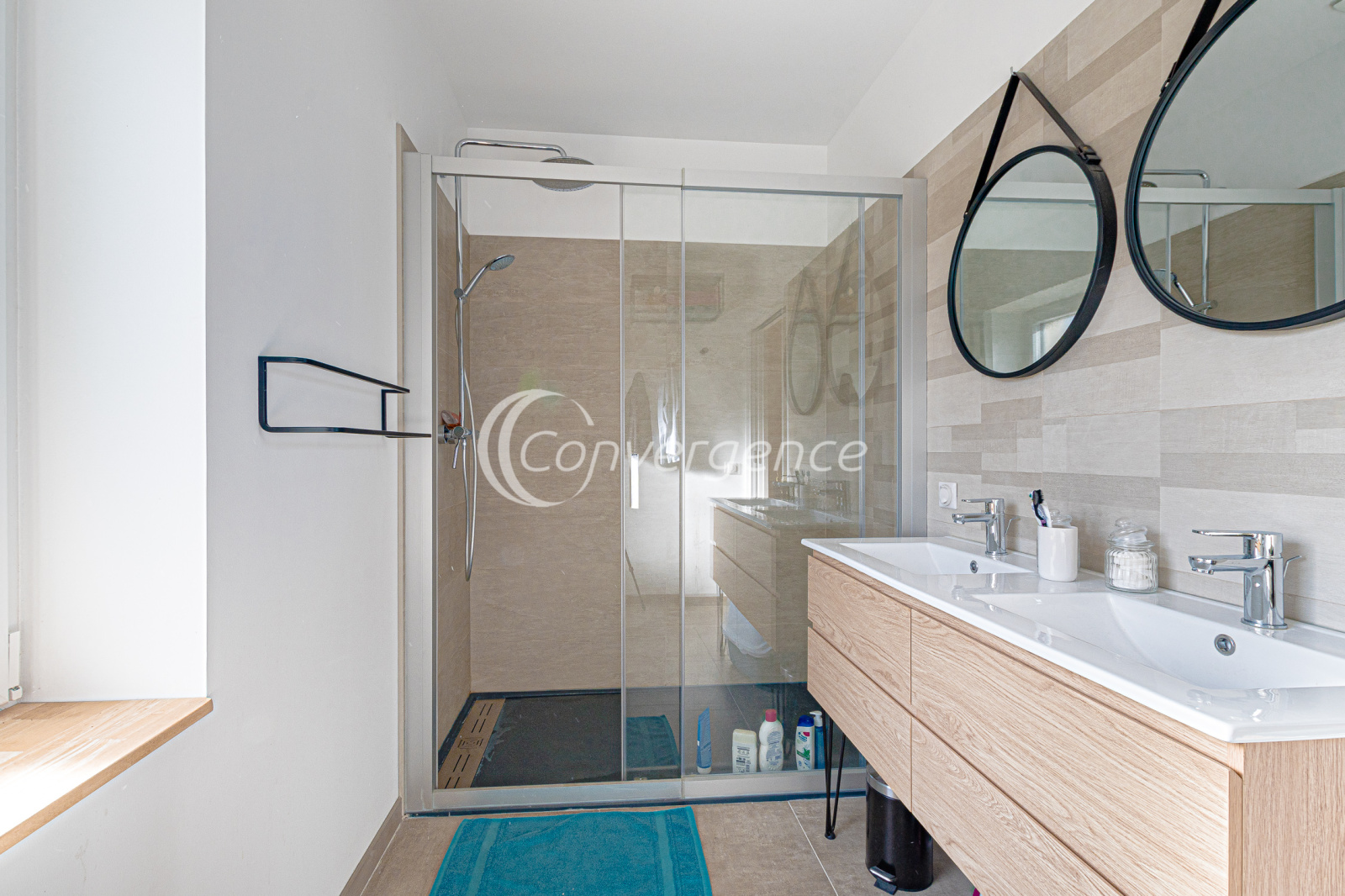 Le rez-de-chaussée se compose d'une grande cuisine aménagée et ouverte sur un vaste salon séjour donnant sur le jardin, et d'un wc avec lave-main. Au premier étage, trois chambres, une salle d'eau avec double vasques.