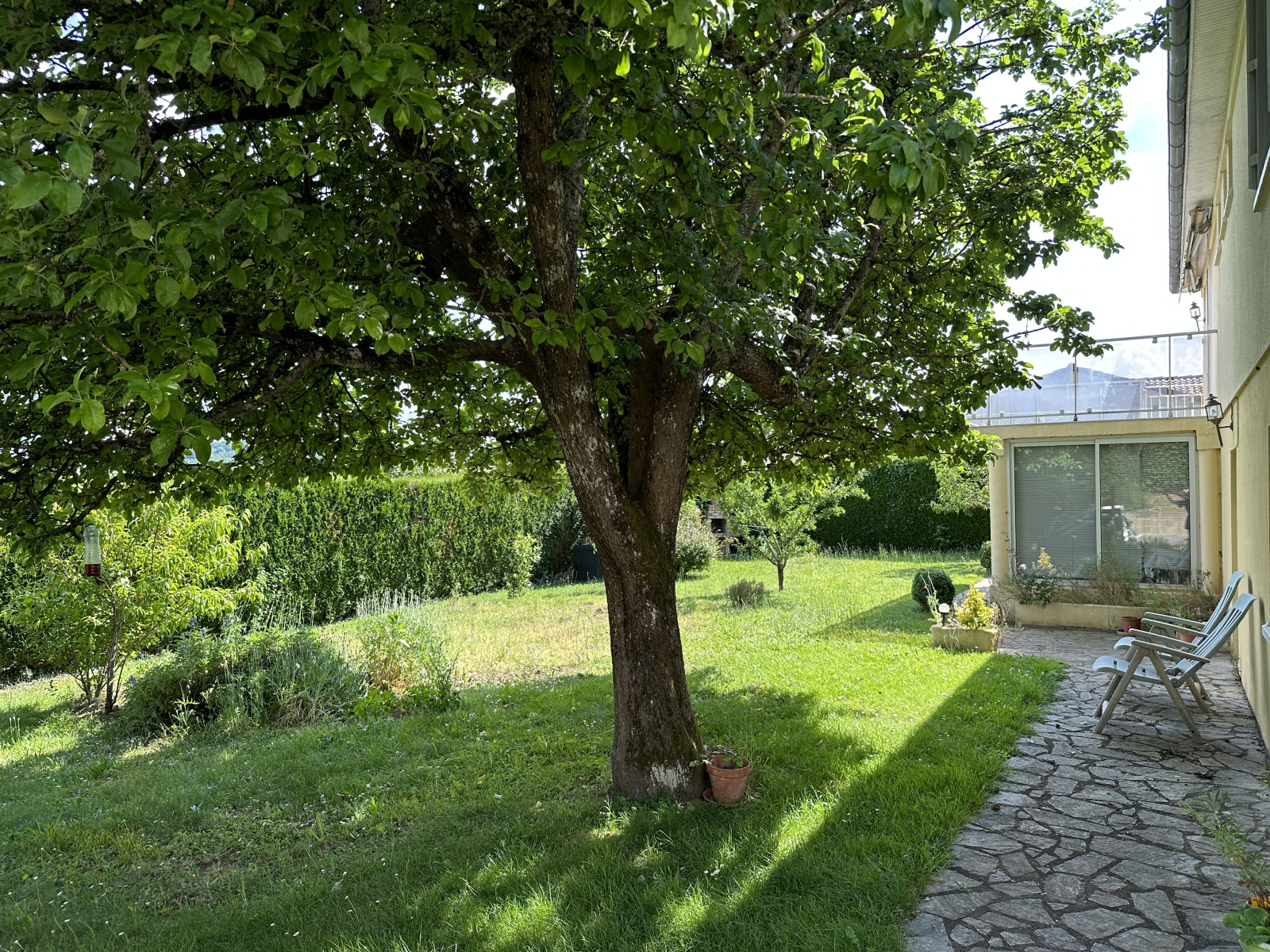 Un jardin bien arboré et entièrement clos vient agrémenter l’ensemble. La vue est dégagée.